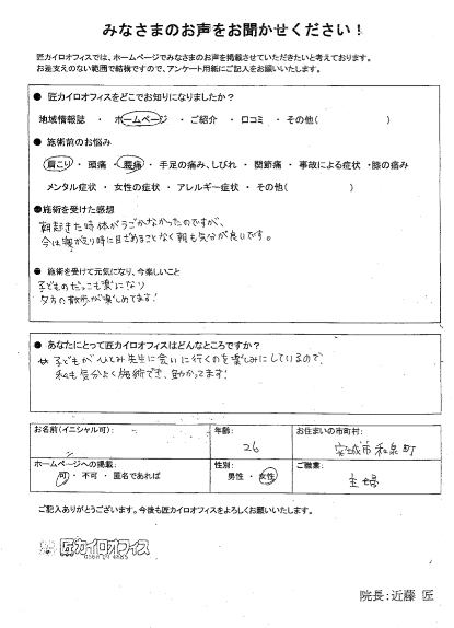 私は、9か月の子供がいるのですが、先生の奥さまにとても懐いてくれて安心して、施術を受けることが出来ました