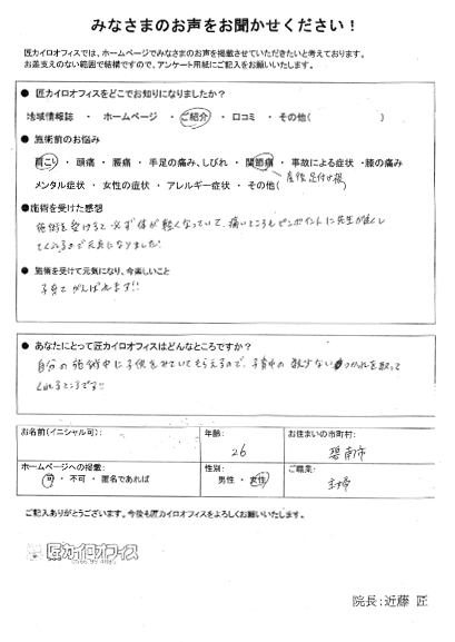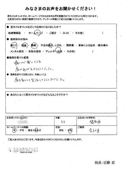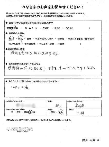 カイロは初めてだったので、とても緊張しましたが院長さんが丁寧に説明をしてくれたので安心して施術を受けられました。